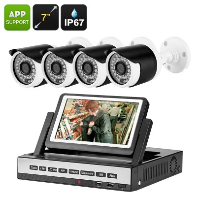 4 قناة DVR كيت - عرض 7 بوصة LCD، 4x و720P كاميرات مضادة للماء، كشف الحركة، للرؤية الليلية، الدعم المتحرك