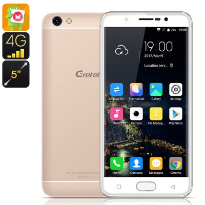 هك مستودع جريتل A9 الروبوت الهاتف - 4G، المزدوج سيم، شاشة 5 بوصة، رباعية النواة وحدة المعالجة المركزية، 2GB رام، الروبوت 6.0، بصمات الأصابع (الذهب)
