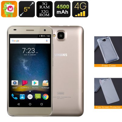 الروبوت الهاتف Uhans H5000 - 5 بوصة IPS العرض، 720P، ثنائي IMEI، 4G، الروبوت 6.0 رباعية النواة وحدة المعالجة المركزية، 3GB RAM، 4500mAh (الذهب)